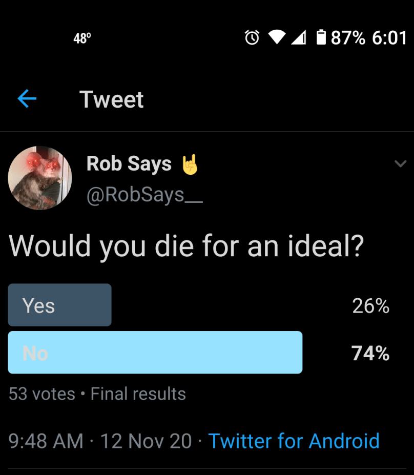 I don’t consider that there was a “right” or “wrong” answer when it came to these polls. You die for whatever you want to die for. I know for me, if I’m going to die for something, it’s going to be more than just a word with some feelings attached to it. I’m going to die for something tangible.