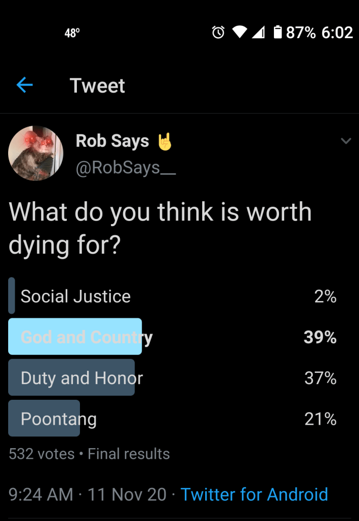 The only other reply that I saw in my first poll that made sense to me was being willing to die for your family and children. Your family is tangible. They are your flesh and your blood. When it comes to children they are your offspring and the future, so I get that one. All of the others are just words. Container words to be exact. None of them have any inherent meaning except what you give them, and what duty, god, country, honor, or even freedom, is going to be different for you as compared to me.