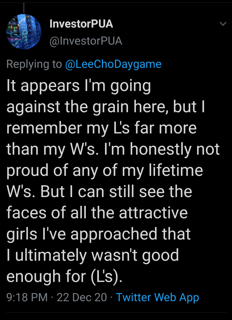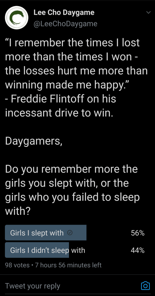 I’m not throwing shade at this guy for his comment to that poll. The truth is, I happen to really like this guy as far as being internet acquaintances goes. I’m also not going to try to read his mind. Why he focuses on his losses is anyone’s guess but his. He’s the only one that truly knows why he chooses to focus on the ones that got away versus the ones that he succeeded with. Does he think he is a failure? Hard to say for sure, but it appears that way to me. His last line “But I can still see the faces of all the attractive girls I’ve approached that I ultimately wasn’t good enough for,” tells me enough. I don’t know his situation, I don’t know the context, the nuance, and the details of his situation. In short, I don’t know enough about him to come to a solid decision as to what is going on here. It’s mostly a wild guess on my part but his tweet stood out to me. I like his honesty and personally, regardless of what he thinks or doesn’t think of himself, I don’t consider him a failure. Whatever he’s doing isn’t working is all. Maybe it’s time for him to try something different. Whether that be approaching women differently in different venues, or even moving to another town, city, state, or country. He has options whether he can see them or not. And if he doesn’t have options, it’s on him to create options for himself. I’m sure he’ll do just fine in the long run.