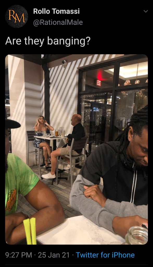 A few days ago, Rollo was out and about with some people and he took the above picture and then asked Twitter, “Are they banging?” He’s referring to the woman and the man in the background in case there is any wonder or confusion.