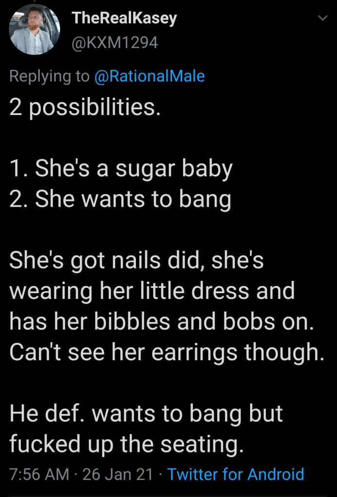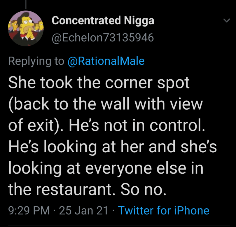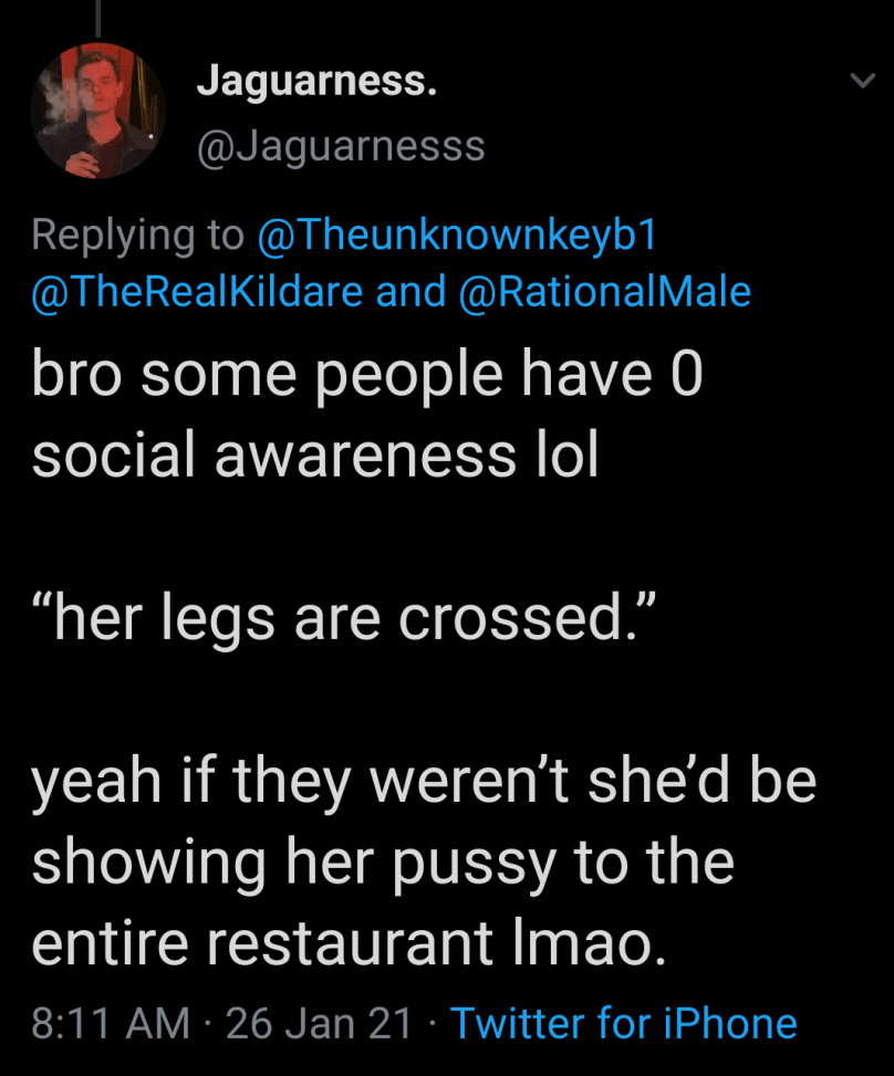Women are incredibly aware of their surroundings. She’s wearing a short skirt, for whatever reason. Maybe she just likes short skirts? She’s sitting on a tall chair at a tall table, her entire body is exposed to the world. Women know when they are wearing something that could reveal the color of their underwear, or the fact that they aren’t wearing any at all.