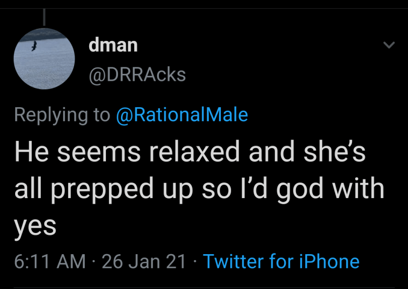 I don’t mind these tweets when they pop up and sometimes it’s blatantly obvious if the people in the photo “are banging” or not. But in this particular case, as with the great majority of the ones that I have seen on Twitter, the only honest answer is, “We don’t know.”