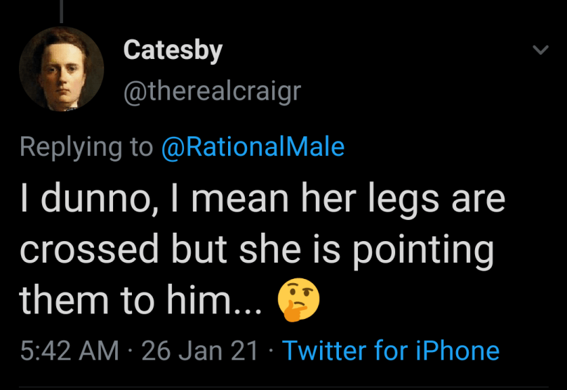 Guys, realize that a picture is just that. A picture. It’s a brief moment in time that happened to be captured. By itself it is useless. You need more information and you need more context. Stop playing amateur armchair psychologist. Stop pretending that you truly understand body language. Just because a person folds their arms or crosses their legs doesn’t mean anything by itself. Stop reading into things that you know nothing about. Unless you were there, watching and talking to the people in the photo, you really have no idea of what is going on. Not even an “educated guess.” Just pulling shit right out of your ass is all you are doing. You need the context and you need more information. All you end up doing in cases like this is you look like an idiot.