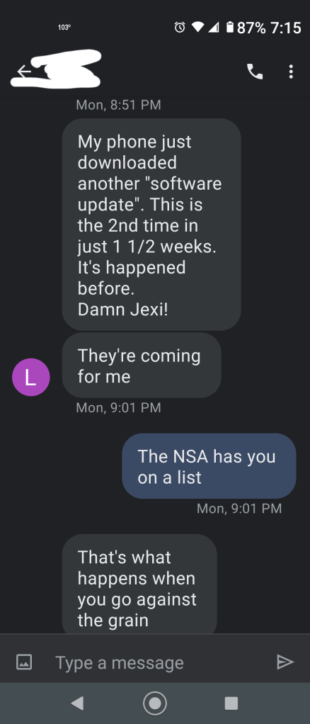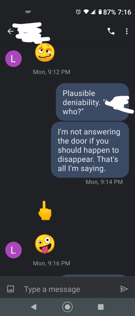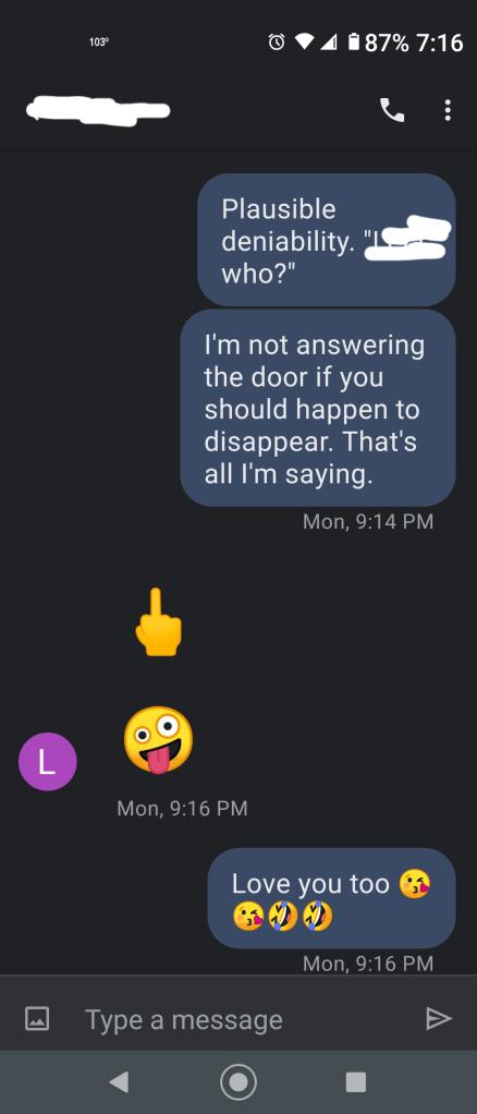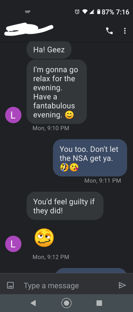 Here’s a recent conversation I had with her, just to give you an idea. Now, I’m sure there are plenty of you out there that would have gone way further or way harsher, but for me, this was an experiment. Remember that this chick has drank all of the Kool-Aid when it comes to outrage and that she is, in fact paranoid: