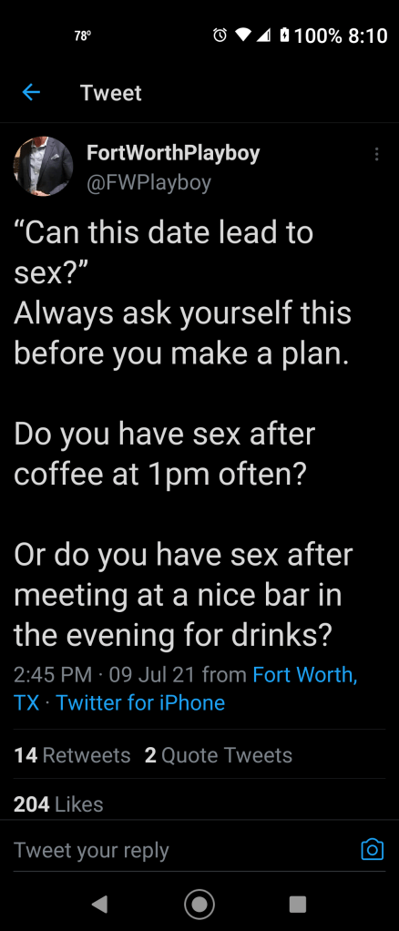 Haven’t “dated” in years, but I’m with you. People put way too much into this stuff. Just go out with her and see what happens. It’s not rocket science, either you will click or you won’t. Also, not a huge fan of coffee anyway. Damn sure not going to pay for it in a coffee shop. What’s up with can’t have coffee and alcohol in Utah? Here, most coffee shops have liquor licenses. In my opinion, why else would you drink coffee? Please don’t tell twitter I don’t like coffee, I believe they ban you for that.