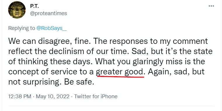 The “greater good” is just another ideal. It’s another container word filled with nothing except what you put into it. I promise you, Hitler, Stalin, and Pol Pot had a different idea of what the “greater good” was, than what you think it is.