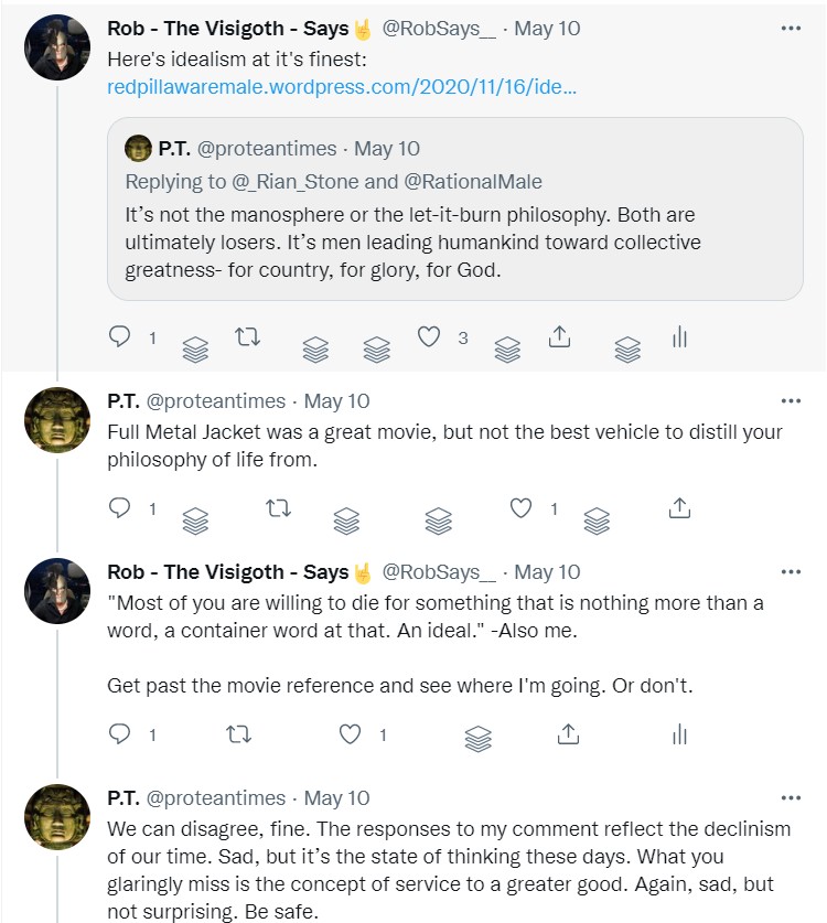 Plenty of causes and ideals out there, plenty of ways to waste your time and your life on your own dime, for somebody who isn’t you or yours. Do you really want to sacrifice yourself, your time, your money, your energy, or even your life for…. Words?