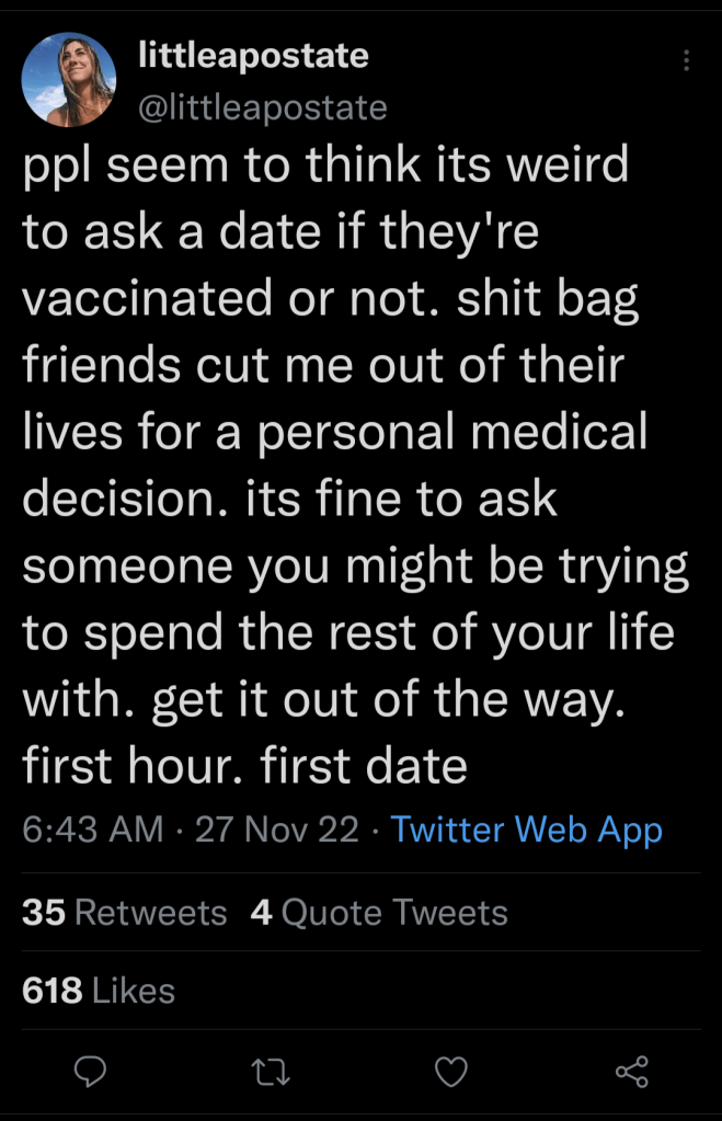 If anyone were to ask me my vaccination status on a first meetup or a first date, I would tell them, “That’s none of your business.” And then I would excuse myself and leave.
