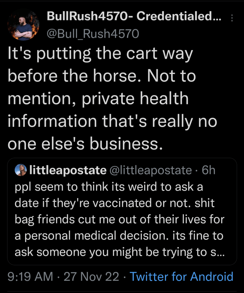 I’ve met plenty of people from Twitter in real life. How they act on Twitter is how they are in real life. If they act like a “sperg” on Twitter, my experience has been that’s how they are in real life. If they say stupid shit like, “What’s your vaccination status?” on Twitter, they will probably ask you or me that in real life. Sorry Pearly, but it’s none of your business. Thank you for your time, but clearly we aren’t going to be compatible.