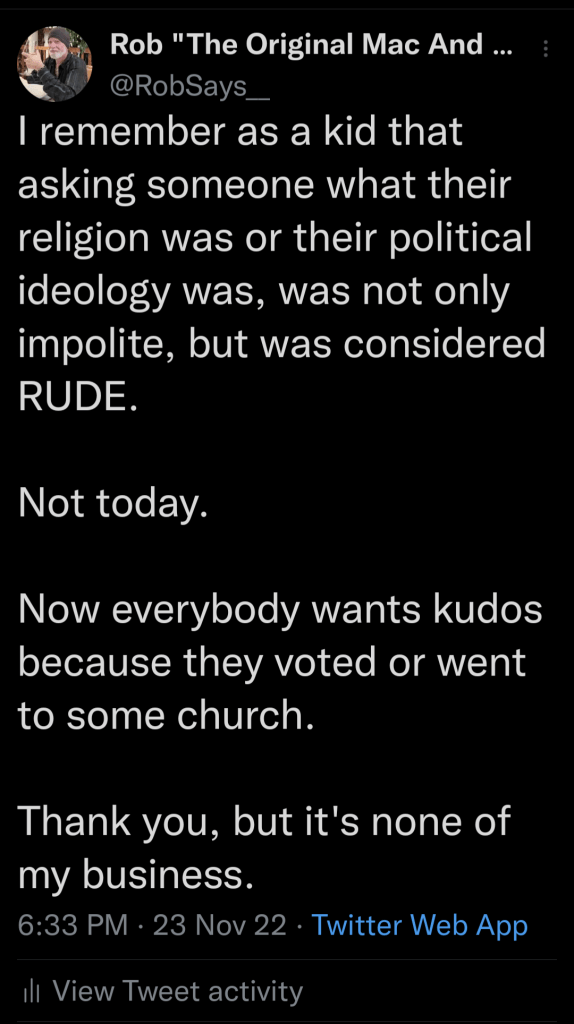 Like I said in the above tweet, when I was growing up, asking someone about what their religious views or their political views were, was considered impolite, if not downright rude. You just didn’t do it. Who you voted for, or even if you voted was no one’s business but yours. Same with whatever brand of religion you believed in or didn’t believe in. I can’t remember a single time in my childhood/young adulthood that someone asked me what I believed in or followed.