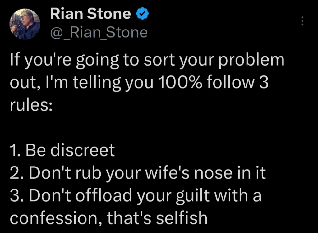 And here we are. When Rian was talking about a guy “sorting out his problem,” he was specifically mentioning something about a guy who decided to cheat on his wife. All three of Rian’s “Rules” are legit if you decide to go down this path. 1. Be discreet. 2. Don’t rub your wife’s nose in it. And 3. Don’t offload your guilt with a confession, that’s selfish.