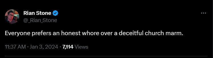 Rian nailed it in the screenshot that I posted: “Everyone prefers an honest whore over a deceitful church marm.” Amen, hallelujah.