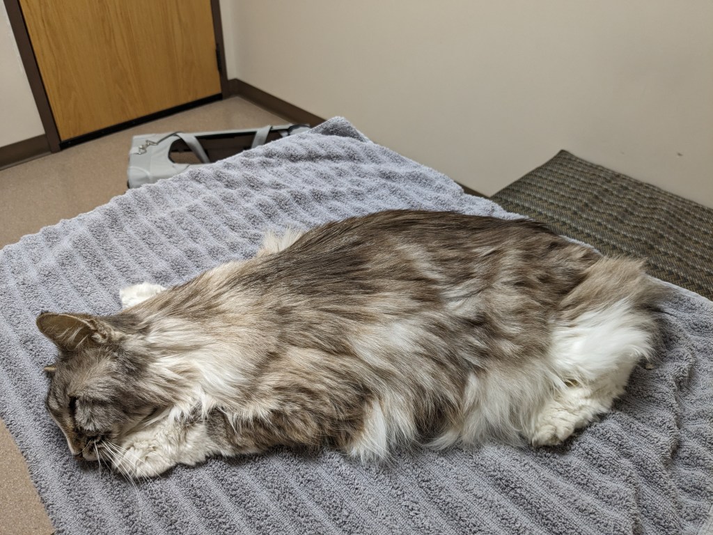But most of all, I’m going to miss you, Nermal. Today, July 15th 2023 was your last day. You had been getting slow and I thought it was just old age, and maybe some of it was. But you lost a lot of weight in the last couple of months. And your sense of curiosity was mostly gone. Instead of sitting on my lap or on the edge of the couch, you hung out on the bed for awhile, and then you hung out in the living room by the closet. And that’s where you stayed unless you would get a sip of water or a bite of food. That’s where you were when it was time.
