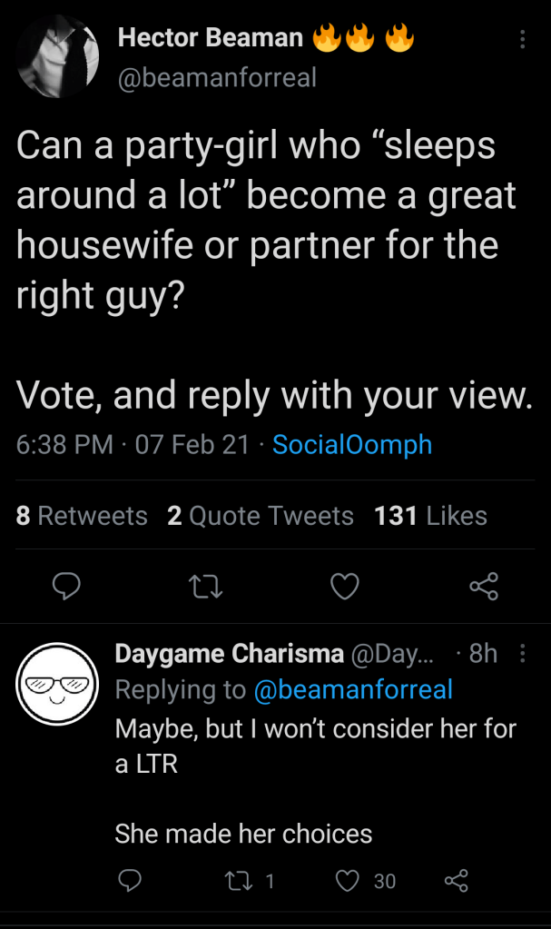 Who cares if a “party girl who sleeps around” can become a great housewife or not? Why would you want to get married in today’s day and age anyway? The screenshot is one of morality, not one of skill or ability. What defines a “great housewife” anyways? I’ll go ahead and answer that question for shits and giggles though: